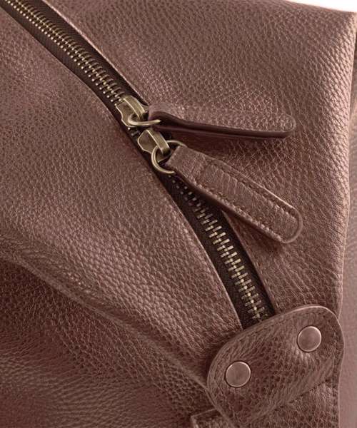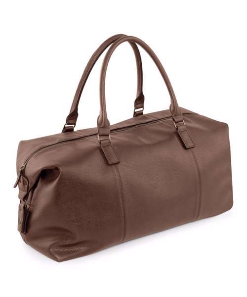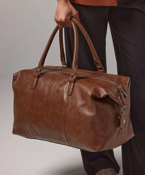 Quality full grain leather look PU. Fully lined in pinstriped fabric. Snap fastening fold down ends. Vintage style metal fittings. Internal valuables pocket. Internal baseboard. Extra long main compartment zip for easy access. Self fabric carry handles. Can be carried by hand or over the shoulder.