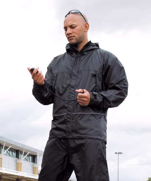 Waterproof (2000mm). Windproof. Foldaway shadow printed lined hood with shockcord adjusters. Stud closing stormflap. Full front zip fastening. 2 mesh lined zip closing side pockets. Tear release adjustable cuffs. Adjustable shockcord hem. Decorative reflecting piping around lower body. Fully taped waterproof seams. Concealed access for print and embroidery. Decoration Guidelines:Decorating methods: Embroidery, Direct print, Transfer print & Screen print transfer. Decorators access point: Hem access.