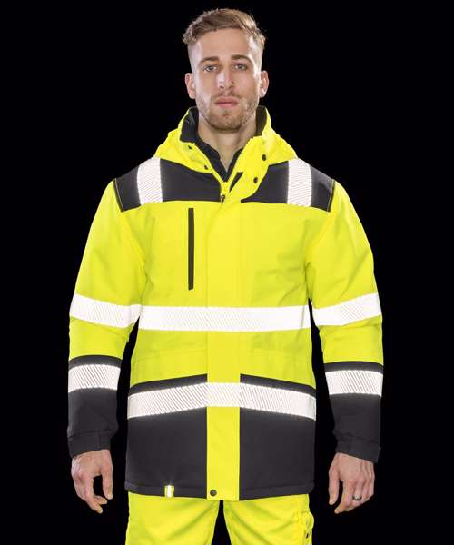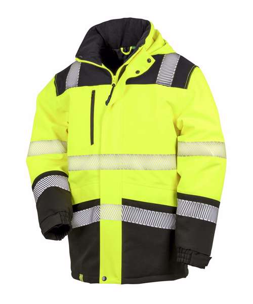 A soft stretch, high visibility safety, waterproof, windproof and breathable garment in printable fabric. Highly technical with features such as tear release and part elasticated cuffs, reflective print body bands and an adjustable foldaway hood, finished off with stylish black colour contrasting.