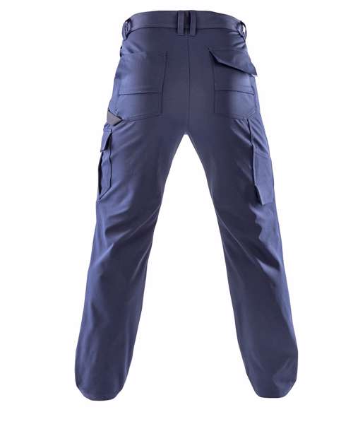 Soft-feel, wrinkle-free stretch fabric, springs back to shape. Elastomultiester fibres' unique structure provides a recycled fabric choice and Elastomultielastane: moisture-wicking properties and increased resistance to damage lead to longer-lasting garments. 9 pockets including reinforced ruler pocket, multicompartment thigh pockets, and expandable back pockets. Trebel stitched critical seams. Side elasticated waistband with high back. Ankle scuff panel masks grime. Articulated knee zone. Zip fly with rivet. Hammer loop. Belt loops. Slim fit. Elastane-free. TPU-free.