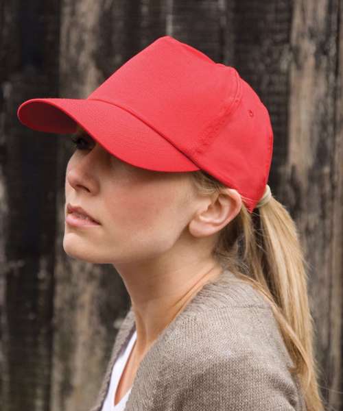 5 panel. Full profile. Pre-curved peak with 6 stitch lines. Hinged front support panel. No centre seam. Stitched eyelets. Easy tear release size adjuster. Decoration Guidelines: Decorating methods: Embroidery & Transfer print Decorators access point: Open.
