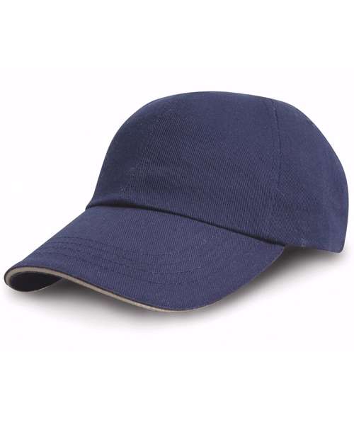 Heavy cotton, stylish cap contrasting colour sandwich peak, smart brass buckle size adjuster.