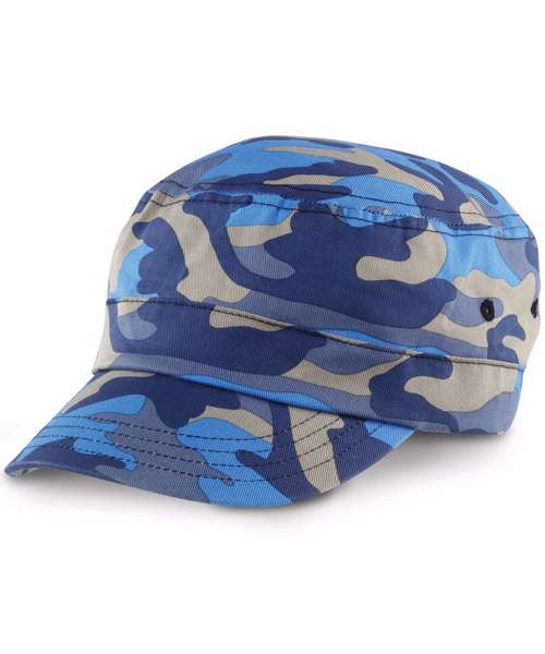 Fashion Camo colours trooper style pre-curved peak with flat stitched seams and a fabric size adjuster with brushed metal buckle.