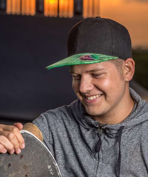Recycled PU peak. Tear away label. CORE value product. 6 panel. Stitched eyelets. Stiffened front panels. Snapback adjuster. Contrast PU pearl fabric flat peak.