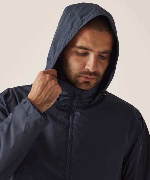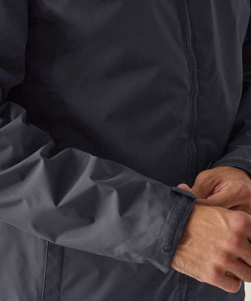 Waterproof Hydrafort 5000 peached polyester fabric. Polyester taffeta lining. Windproof fabric. Critically taped seams. (Inner) 220 series anti-pill symmetry fleece. 2 Lower pockets. (Special Features) Concealed hood with adjuster. Adjustable cuffs. 2 Zipped lower pockets. Hook and loop fastening at hem for embroidery access.