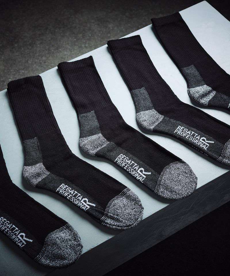 The Pro work socks from Regatta Professional. Comfortable and hard-wearing, these socks feature a durable loop stitch cotton blend for long-lasting comfort. There’s a cushioned heel and toe, too, and the ribbed ankle provides extra support. Ideal for working on the farm or at the stables. Pack of 5.