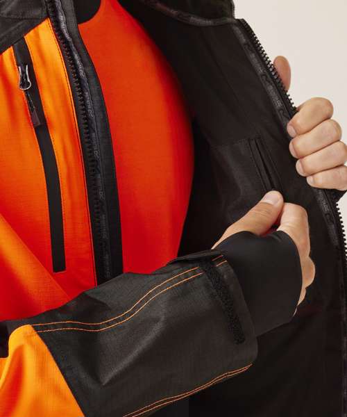 Waterproof and breathable Isotex 10000 100% polyester ripstop fabric. Certified EN ISO 20471:2013 +A1:2016 Class 2. Conforms to EN343:3.3. Heat-applied reflective tape, with segmented tape on strategic panels for additional comfort. Pit zips for added breathability. Foldaway hood with adjuster. One internal zipped chest pocket and internal bottle holder pocket. Six pockets. One radio loop. Inner stormguard. ID reflection – angled chevrons identify which way you are facing. Made with recycled content.