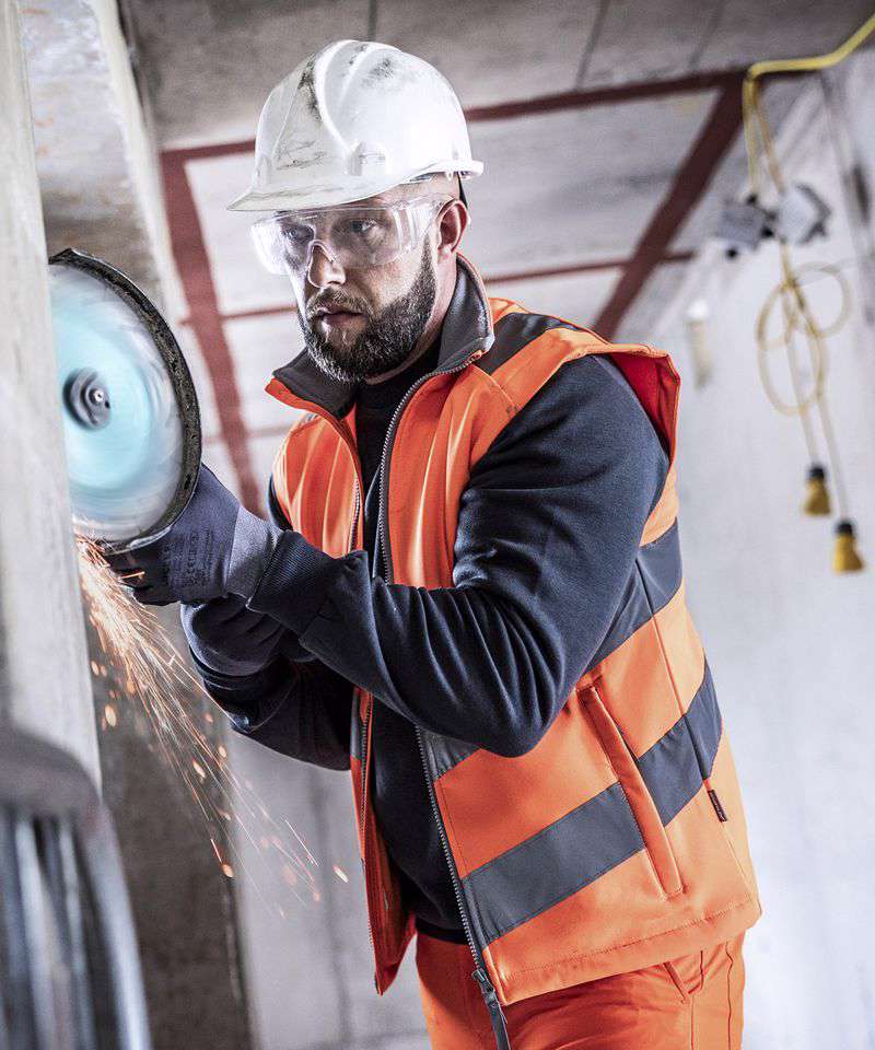 Warm-backed softshell fabric. Printable softshell fabric. Certified to EN ISO 20471:2013 A1:2016 Class 2. Orange colourway also certified to RIS-3279-TOM. Two lower zipped pockets. Fleece-lined collar. Zip guard for comfort when worn. Contains recycled polyester.