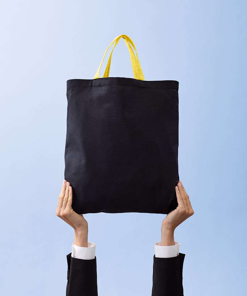 Two-tone cotton shopper. Short handles, 35 x 2.5cm. Inside hemmed sewing. Cross-stitches at handle. Perfect print surface.