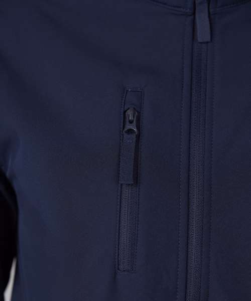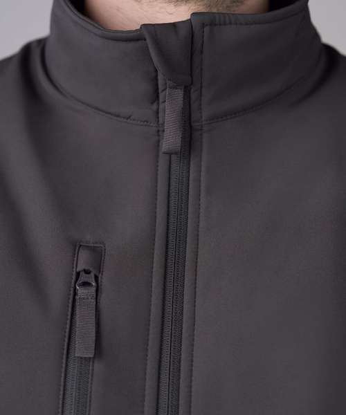 Standard fit. Full-zip front. Zipped chest and side pockets. Printable three-layer binded softshell fabric. Chinguard. Internal storm flap. Adjustable shock cord hem. Windproof and showerproof.