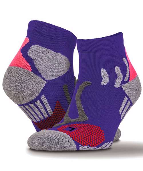 Anatomically shaped with reinforcement for optimum protection and compression. Strategic double-layer cusion impact. Pinpoint compression layers stimulate circulation. Coolmax® yarns keep cool and dry. Rib cuff. Durable knit. Trainer length. Contrast colour trim. Heel/Toe cushioning and arch support. Fast-dry.