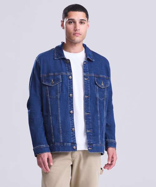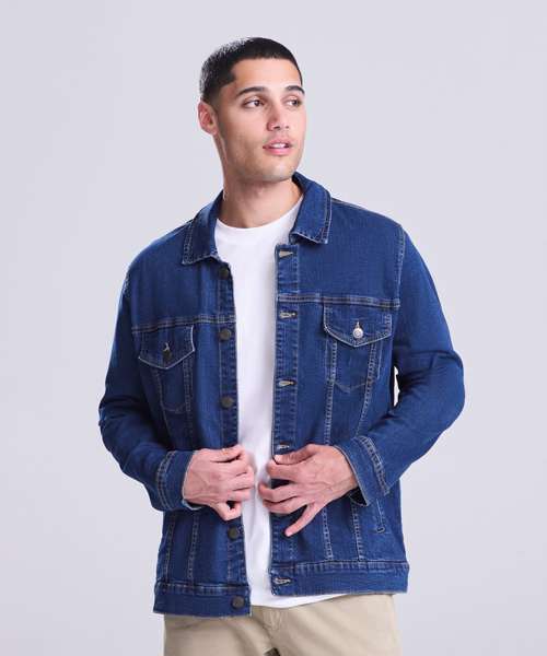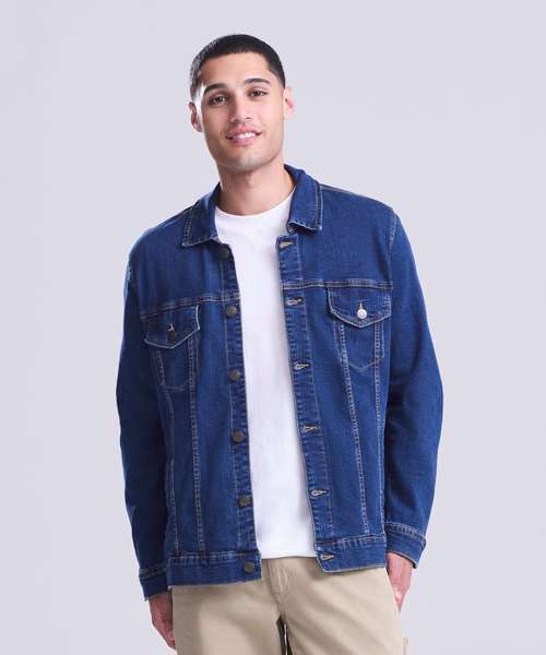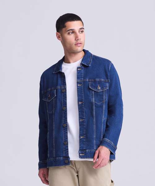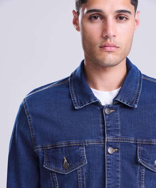 Cotton/elastane blended denim jacket with classic denim styling. 4 pocket design, shank button placket, button cuffs and adjustable back. Fashion fit. Stretch denim. 4 pocket styling. Classic light and dark blue washes. Contrast stitching. Classic denim jacket panelling. Button cuff detail. Inside back neck hanger loop.