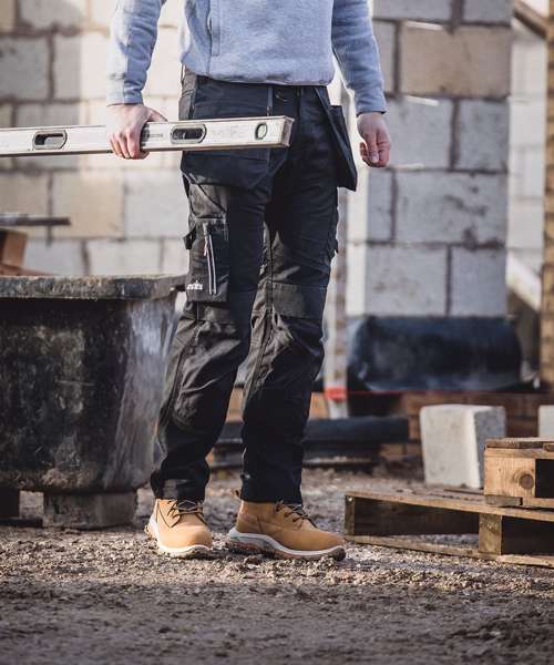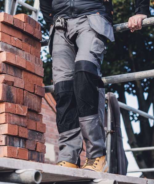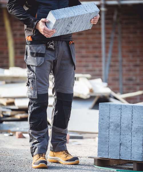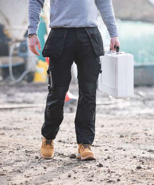 Durable work trousers made from heavy-duty twill fabric with stretch panels for comfort and flexibility. Two-layered reinforced seat for long-lasting performance. Tapered fit – wider in the thigh and tapered at the hem for a modern and comfortable fit. Abrasion-resistant, top-loading Cordura® knee pockets with two positions for comfort and durability. Hard-wearing, abrasion-resistant hem and pocket reinforcements. Easy-access holster pockets with tool loops for tool and accessory storage. Cargo pockets with zipped section, rule pocket, mobile phone pocket, hammer loops and D-ring. Certified Sedex.