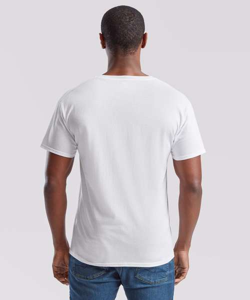 Rib v-neck. Self-fabric back neck tape. Fine knit gauge for enhanced printability.