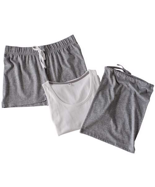 Relax in style with the soft and lightweight pyjama set featuring a white vest with contrast shorts and matching drawcord bag. Available in attractive colourways.