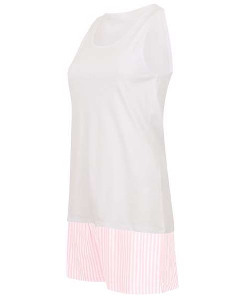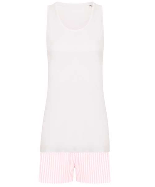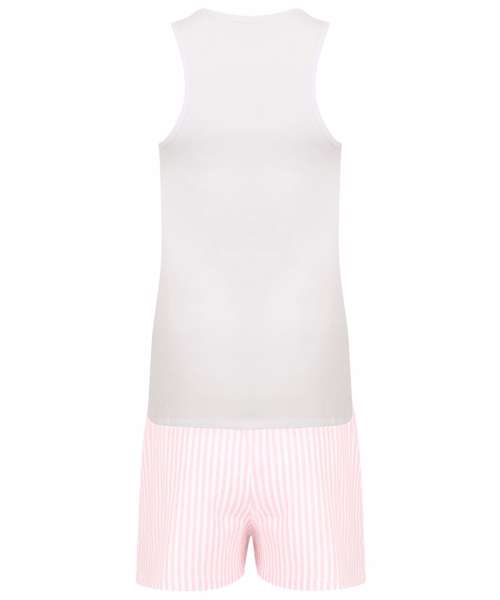 Women's short pyjama set with a white racer back vest with contrast shorts with an elasticated and draw cord waist. Side slits for ease of movement. Soft single jersey perfect for decoration. Keep away from fire.