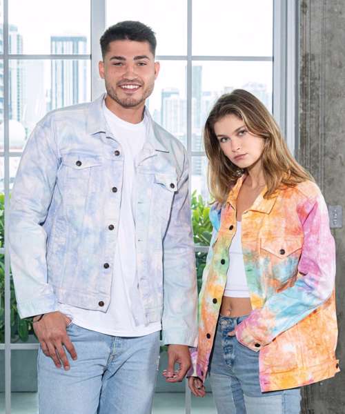 Make a statement in this tie-dye denim jacket. It’s a timeless wardrobe option, thanks to its vibrant pop of colours that can enhance any outfit, as well as a versatile layering piece. The jacket has a contemporary, loose unisex fit in classic denim styling and features chest pockets with button flap closure.