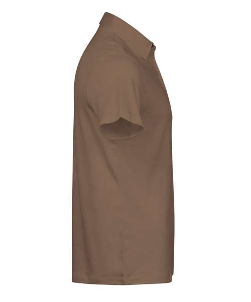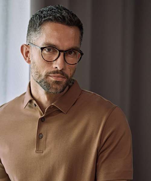 A stylish, state-of-the-art interlock polo shirt in 44 singles 100% Pima cotton, featuring a slim-fitted body. It has a self-fabric, stand-up collar, finished with an elegant placket with anthracite pearl imitation buttons.