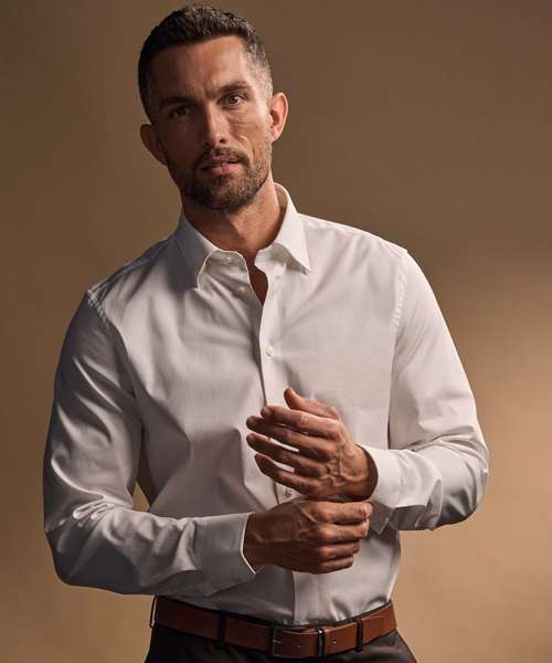 The Stretch luxury shirt is a fitted men’s dress shirt with stretch for total comfort. It features a button-under collar with completely invisible button placement and two-button cuffs.