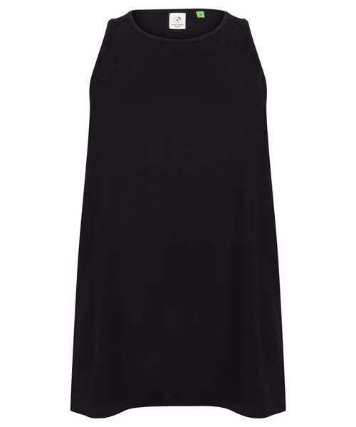 Soft-touch single Jersey fabric. Self-fabric binding at neck and armholes. Wide racer back with forward facing shoulder seams. Long back with split up the middle, which can be worn open or tied up. Curved back section where split begins. Tombo tear-out label.