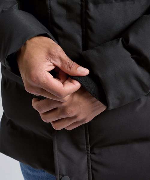 100% Recycled polyester. Full-length zip with storm flap. Concealed rib knit cuffs. Removable peaked panelled hood. Bonded baffles. Front pockets with decorative stitching. One internal pocket. Square back neck buggy. Removable recycled zip pull.