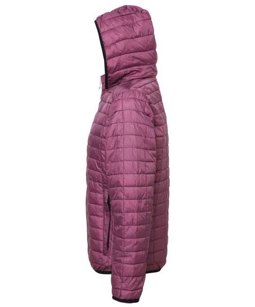 Contrast coil zip on centre front with signature zip puller and mouse tail piping on each side of zip opening. Front and back square stitched baffles with linear side narrow baffles. 250gsm lightweight polyester fill. Fully-lined in tonal polyester. Inset welt pocket with concealed zip opening and double zip garages. Contrast stretch binding on hem, cuffs and hood opening for added protection. Internal piping around inside facing. Secure hood attached to collar. Internal zipped opening on back panel for embroidery access. Internal welt pocket. Product contains no branded neck label.* Removable Kimble or looped garment tags. Inner seam label holds important product information on one label with a second label containing brand information which can be cut-away.