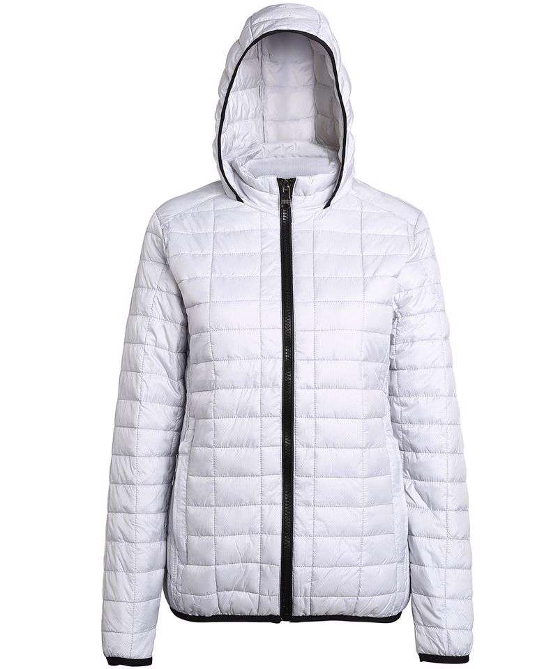 Fitted padded jacket. Honeycomb pattern with horizontal and vertical stitching. Piped edging. Zip fastening and two covered zip side pockets. Underside is lined with an open trim pocket useful for carrying mobile devices. Access point to inner jacket for easy embellishment. Elasticated cuffs and hem. High neck collar stand with attached hood. Product contains no branded neck label.* Removable Kimble or looped garment tags. Inner seam label holds important product information on one label with a second label containing brand information which can be cut-away.
