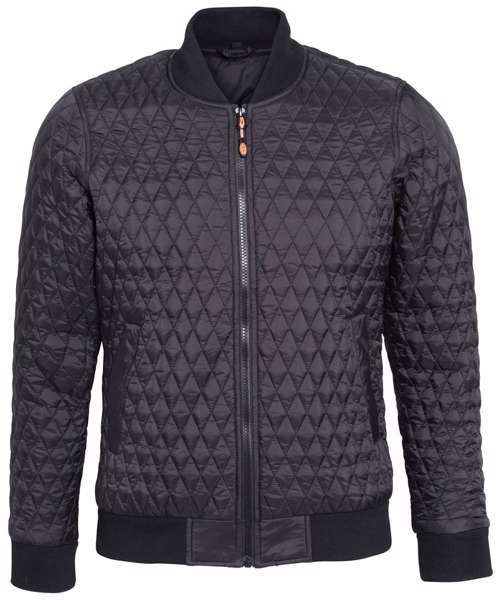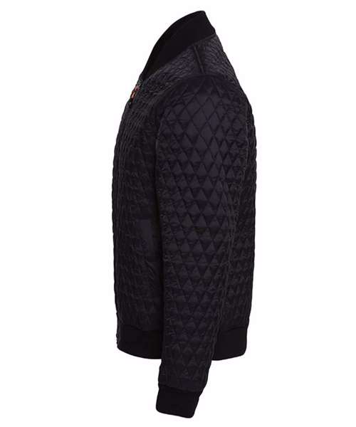 Slim fit jacket. Diamond shaped quilting. Bomber style jacket. Elasticated ribbed knit collar, cuffs and hem. Finishes just beneath the waistline. Full zip through bungee cord style zip. Interchangeable zip colours in orange and black. Two side slit pockets and internal zip pocket. Access point in internal lining makes for easy access for embellishment. Product contains no branded neck label.* Removable Kimble or looped garment tags. Inner seam label holds important product information on one label with a second label containing brand information which can be cut-away.