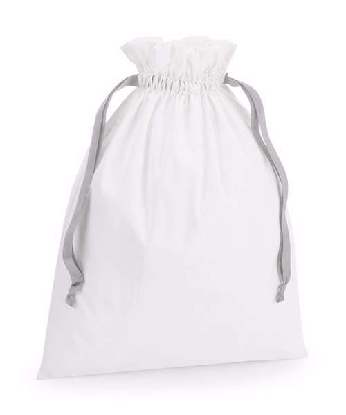 100% Brushed cotton, 140gsm (4.1oz/yd²). Perfect for seasonal gifting. Multipurpose use. Contrasting colour ribbon. Ribbon drawstring closure.TearAway label for easy rebranding.