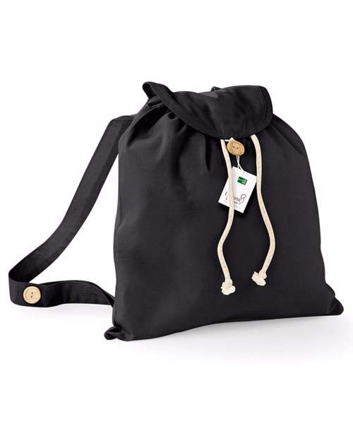 Adjustable shoulder straps. Drawcord closure. Wooden buttons. Grab handle. 100% Certified organic cotton.