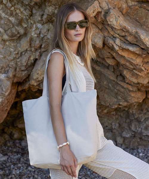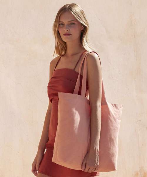 100% Organic cotton, 140gsm (4.1oz/yd²). Coloured with sustainably-derived natural dyes. Subtle variations in colour due to natural dyeing process. Large capacity. Fades beautifully over time. Can be carried by hand or over the shoulder. TearAway label for easy rebranding.