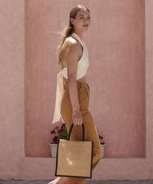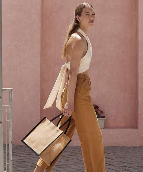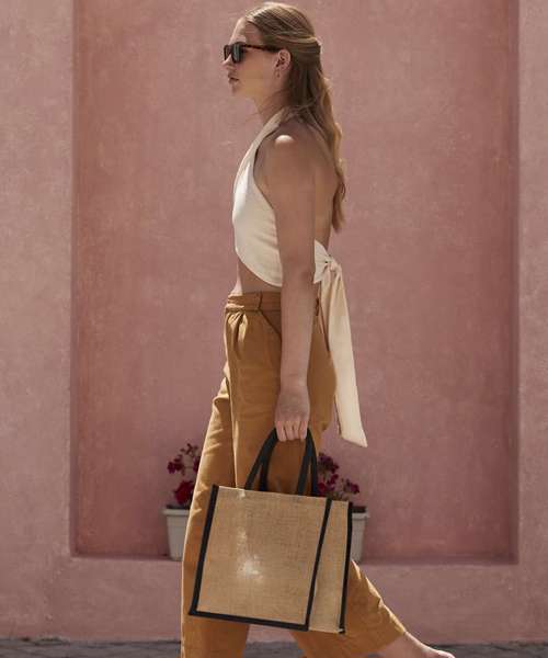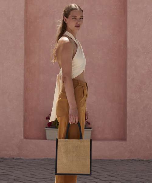 Every piece in the unlaminated Natural Starched Jute collection has angular edges and a sturdy construction for more boxy styling and structured storage. The fabric is tactile to the touch and organic in aesthetic, yet still robust and reliable. This midi tote is made for those who love a shopper-style bag but want something slightly smaller, but still with ample capacity for all the essentials. Contrast colour handles add an extra touch of rustic charm.