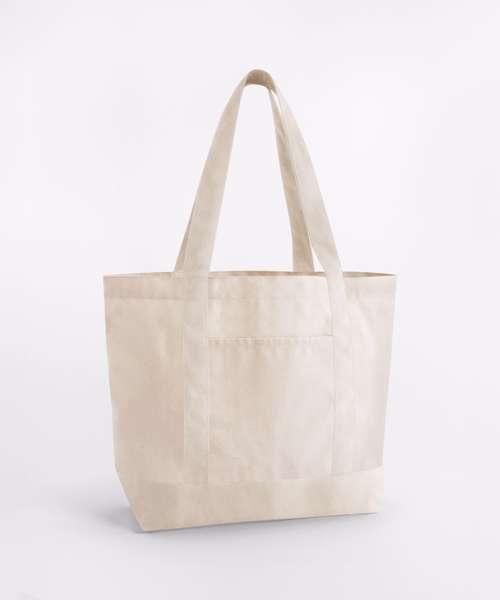 Premium heavyweight fabric. External slip pockets. Contrasting colour base and handles. Self-fabric carry handles. Can be carried by hand or over the shoulder. Contains 100% GOTS-certified organic cotton, certified by Control Union CU811033.