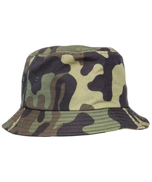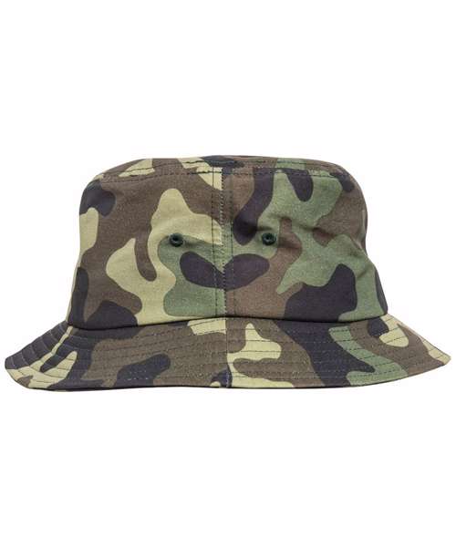Camo bucket hat. Green camouflage pattern. Circumferential brim. Decorative stitching.