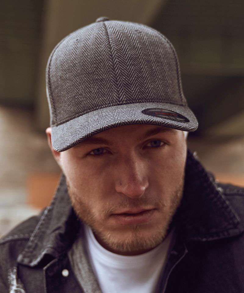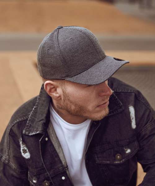 Herringbone melange Flexfit. Sporty shape. Patented Flexfit technology. Classic herringbone pattern. Tweed look. Cool and dry function.